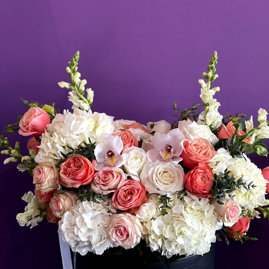A lush and artfully designed arrangement featuring premium fresh blooms, thoughtfully styled to bring beauty and elegance to any occasion. Available in a variety of colors to match your mood or décor — simply note your preferred color when ordering
