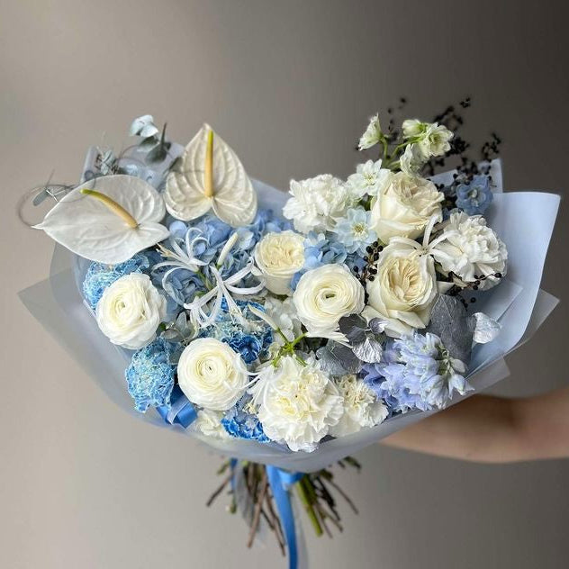 Elegant and serene, the Raya bouquet is a poetic blend of soft whites, icy blues, and airy textures — a floral composition that radiates calm, luxury, and clarity. Its sculptural form and cool-toned palette evoke a sense of quiet sophistication, ideal for meaningful moments and refined spaces.